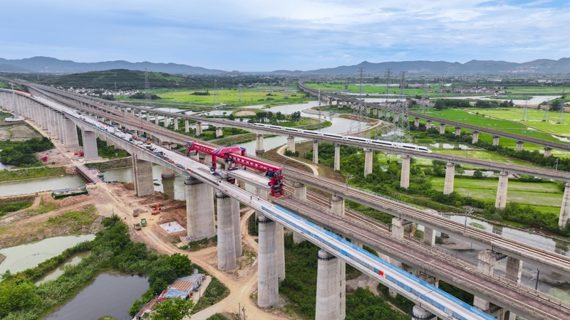 2025年7月8日,巢马城际铁路全线箱梁架设完成,为全线按期通车奠定坚实基础。新华社发(刘志旭摄)