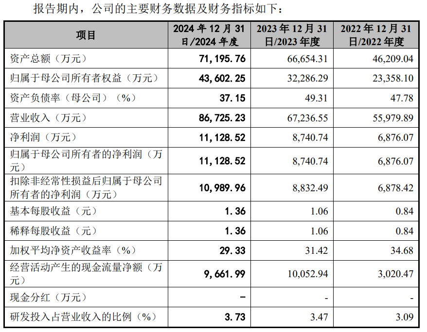据招股书,从财务数据来看,2022年至2024年,公司营业收入分别为55979.89万元、67236.55万元和86725.23万元,净利润分别为6876.07万元、8740.74万元和11128.52万元。